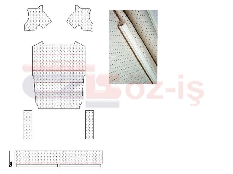 VW 1300 ve 1303 Araçlarına uyumlu tavan döşemesi Krem renkli suni deri üzerinde delikler mevcutdur. Tavan döşemesi beraberinde Tavan yan kulak ve yan direk kaplamaları ayrıcı yan direk fitilleride mevcutdur.